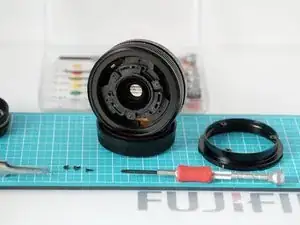 Первый шаг классический для объективов XF – отвинтите четыре серебристых и три чёрных болта, снимите внутренний чёрный пластиковый цилиндр, освободите модуль контактов и, наконец, снимите крепёжное кольцо байонета.