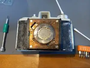 Отсюда вы можете открутить 4 угловых винта, чтобы добраться до механизма затвора или сфокусироваться на группе линз для очистки пыли или возможной плесени.