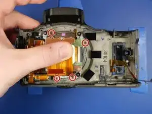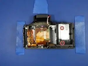 Поскольку камера отключена и аккумулятор вынут, электронно управляемая выдвижная вспышка не работает. Поэтому продолжать ремонт неудобно: добраться до двух винтов напрямую невозможно.