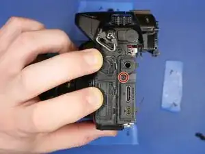 Есть ещё один винт, удерживающий плату. Снимите винт на левой стороне камеры, который крепит крышку интерфейсных разъёмов к плате.