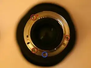 Снимите 4 винта вокруг стального кольца, чтобы разобрать датчик (синяя зона) и пластиковое кольцо (красная зона), которое вставлено внутрь стального кольца и расположено за датчиком