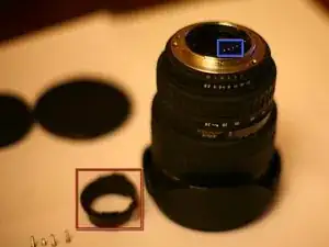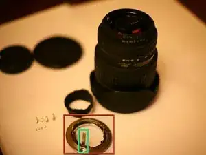 Снимите стальное кольцо (красная зона) путем вертикального сдвига (будьте осторожны с вертикальной пластиной, в зелёной зоне — металл, которая используется для открытия диафрагмы)