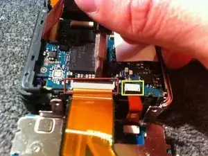 Аналогично отсоедините ленточный кабель, соединяющий основные элементы управления камерой с корпусом матрицы и аккумулятора.