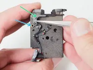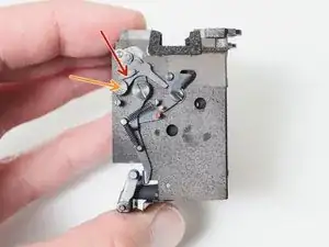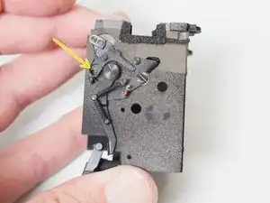 Длинный серебристый рычаг — это рычаг взвода зеркала. Он подталкивает чёрный стержень к верхней части пазa при взводе камеры, что взводит основную пружину зеркала.