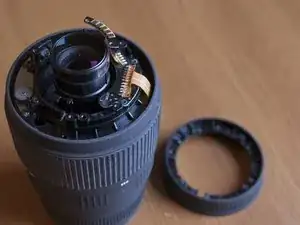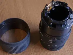 Открутите винты, которые удерживают верхнее пластиковое кольцо (оно является частью корпуса объектива), и снимите его.