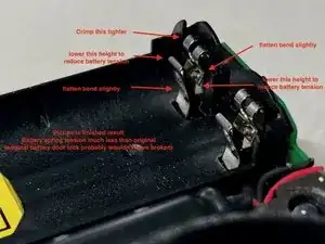 Используйте небольшие плоскогубцы для регулировки натяжения пружины батареи в соответствии с диаграммой. Если бы оригинальное натяжение пружины было уменьшено, крышка батарейного отсека, вероятно, не сломалась бы.