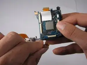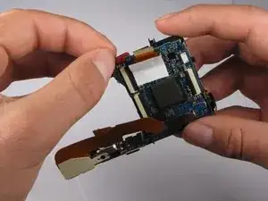 Оттяните назад маленькую серую защёлку, расположенную с правой стороны камеры, чтобы освободить материнскую плату из корпуса.