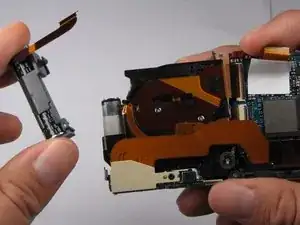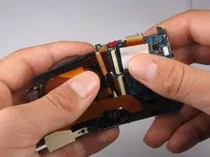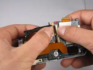 Аккуратно отсоедините левый ленточный кабель от верхней панели камеры, потянув за место его соединения с верхней панелью.