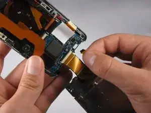 Аккуратно отсоедините правый ленточный кабель от верхней панели камеры, потянув за место его соединения с верхней панелью.