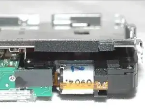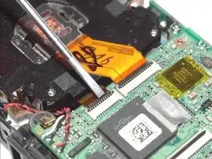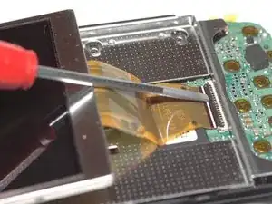 Чтобы отсоединить ленточный кабель ЖК-дисплея, аккуратно поднимите маленькую чёрную фиксирующую планку плоской отвёрткой или лопаткой
