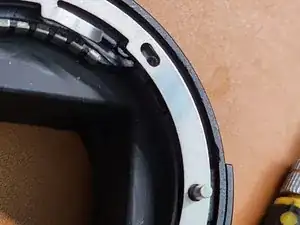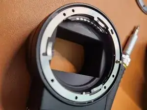 Сначала мы снимем переднюю панель крепления объектива Nikon. Обязательно запомните, где находится белая точка.