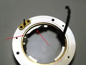 Верните рычаг диафрагмы (см. левую стрелку) и фиксирующее кольцо на металлическое кольцо, как показано на фото. Подключите пружину (см. центральную стрелку), если она была отсоединена.