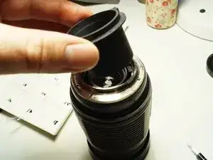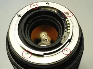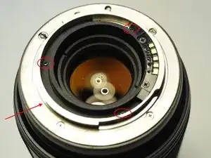 открутите 4 винта и снимите металлическое кольцо. К металлическому кольцу прикреплён рычаг перемещения диафрагмы, поэтому его нужно сдвинуть далеко.