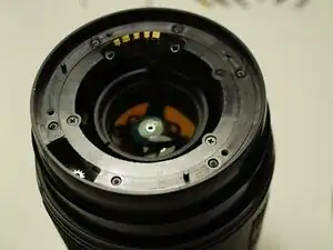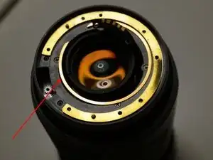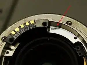 Установите металлическое кольцо обратно и выровняйте штифт автофокуса с зубчатым колесом в корпусе объектива. Немного поверните его отвёрткой, пока он не войдёт в отверстие зубчатого колеса.