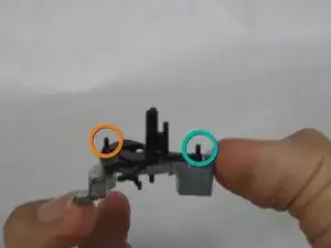 Совместите бирюзовую и оранжевую вкладки с первой фотографии с соответствующими бирюзовыми и оранжевыми отверстиями в элементах затвора.