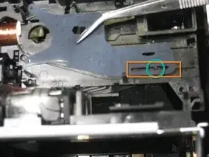 Верните чёрный пластиковый элемент в камеру, убедившись, что вкладка вставлена в паз (прямоугольник) и насажена на штифт (окружность).