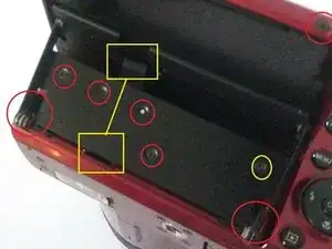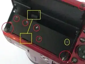 Снимите защитную крышку (как на фото) и используйте что-то тонкое и плоское, чтобы поддеть ЖК-экран из металлической рамки. На задней стороне внутреннего ЖК-экрана находится соединение с корпусом камеры.