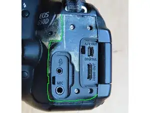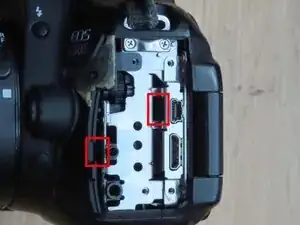 Слева от корпуса камеры расположены два кожуха интерфейсных терминалов, закрывающие разъемы для микрофона, дистанционного управления, USB и HDMI кабелей. Эти крышки рано или поздно могут порваться, когда резина со временем затвердевает.