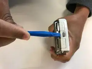 С помощью пластикового инструмента приподнимите заднюю панель камеры. Будьте осторожны, чтобы не прикладывать слишком много сил, чтобы не повредить камеру.