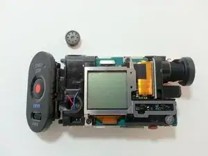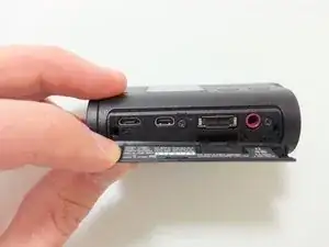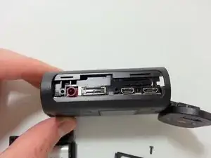 Вдвиньте электронику обратно в корпус. Верните нижнюю крышку порта и закрутите 2 винта. Вставьте аккумулятор. Отрежьте крепление-ниппель у нижней крышки, снова установите её на дне камеры.