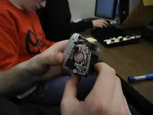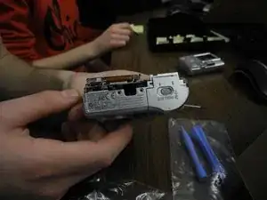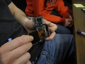 Здравствуйте! Сегодня Вы научитесь разбирать переднюю часть камеры Nikon Coolpix 5600. Вам понадобятся камера Nikon Coolpix, монтажный инструмент iFixit и крестовая отвертка Phillips №00. Первый шаг — снять переднюю панель камеры с материнской платы. Для этого необходимо потянуть каждую сторону передней и задней частей камеры.
