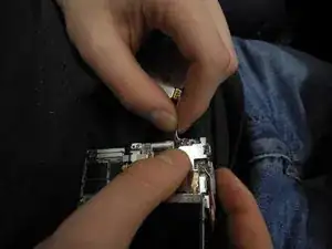 Поднимите черный фиксатор, удерживающий плоский шлейф на материнской плате, и извлеките шлейф с платы.