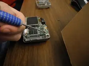 Теперь возьмите крестовую отвертку Phillips №00 и выкрутите винт в нижнем правом углу. Вынув винт, положите его на стол.