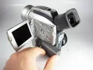 Удерживая кнопку отпирания аккумулятора в стороне, сдвиньте аккумулятор к себе, мимо кнопки отпирания.
