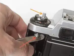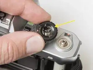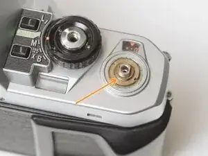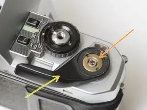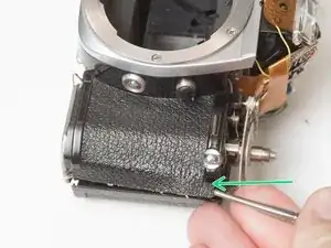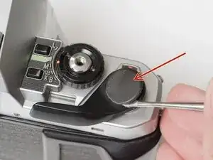 Чтобы проверить работу зеркала и затвора, заведите камеру, затем вставьте инструмент в этот слот и сдвиньте рычаг отпирания влево.