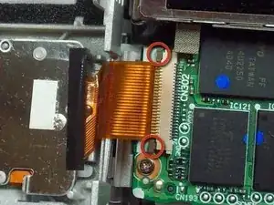 Сдвиньте серые вкладки вниз к основанию камеры, чтобы освободить шлейф. Осторожно отключите шлейф от материнской платы.