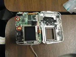 Снимите два винта на верхнем краю платы справа от видоискателя.