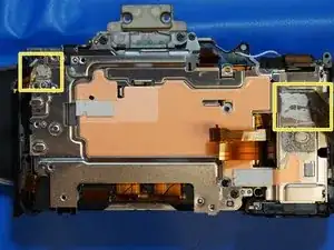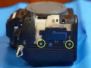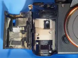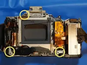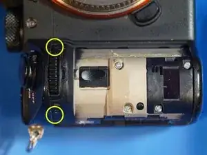 2 винта находятся за тем местом, где был видоискатель, частично скрытые под накладкой в собранном виде. Они серебристые, хотя на фото выглядят чёрными.