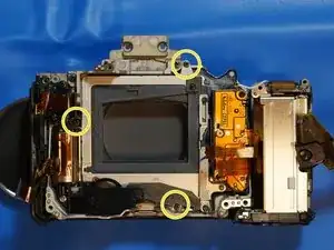 Удалите винты электронного видоискателя, включая винт, который держит ручку фокусировки.