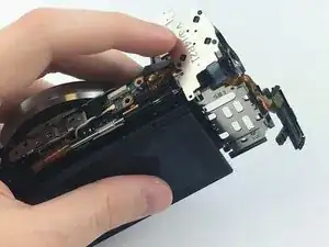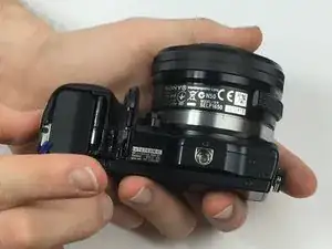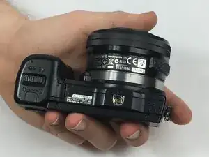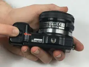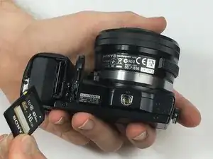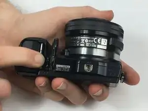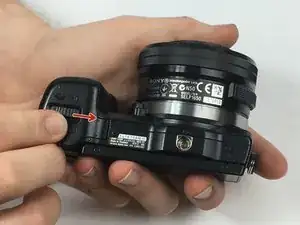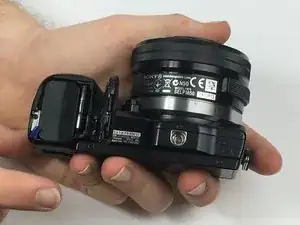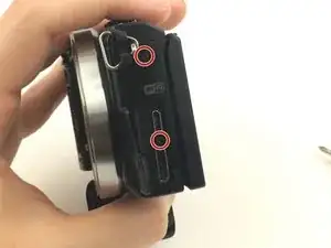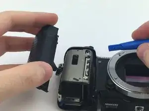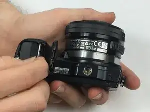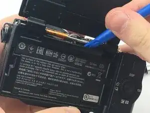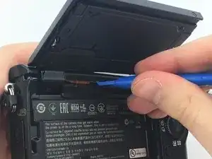 Переверните камеру так, чтобы сенсор был направлен вниз, и подденьте заднюю крышку от отсека батареи снизу вверх.