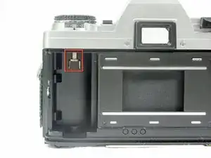 Поднимите рычаг при巻ивания и поверните его по часовой стрелке, чтобы открыть заднюю камеру для пленки.