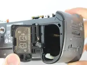 Откройте крышку аккумулятора, нажав на кнопку на крышке в направлении, параллельном нижней части устройства, одновременно отводя крышку от устройства.