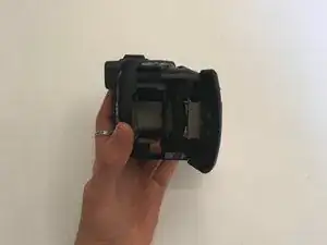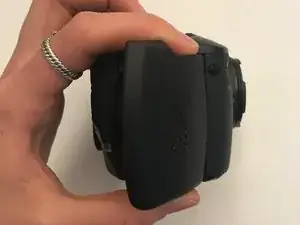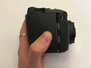 Найдите крышку отсека аккумулятора с правой стороны камеры. На крышке имеется надпись: “CF/BATT.OPEN”.