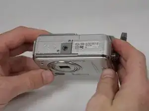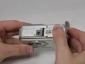 Найдите крышку аккумулятора на нижней стороне камеры, напротив стороны с кнопкой питания.