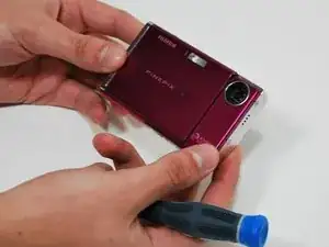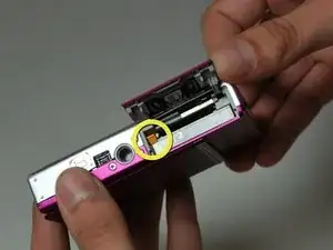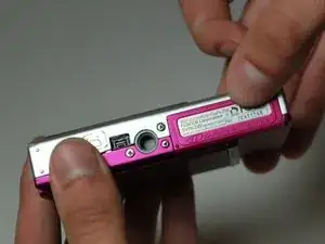 Откройте крышку аккумулятора, расположенную на нижней стороне камеры справа, нажав на нее и сдвинув вперед.