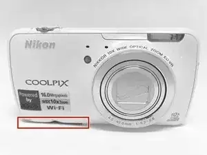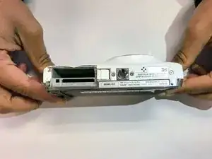 С помощью пластиковой лопатки откройте крышку отсека аккумулятора, расположенную внизу камеры, слева, если объектив направлен на вас.