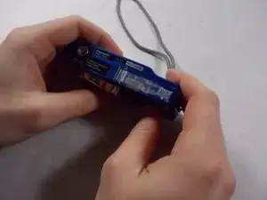 Держите камеру так, чтобы кнопка спуска затвора была направлена вниз. Найдите дверку для аккумулятора и карты SD. Она будет обозначена надписями 'SD Card/Battery'.