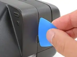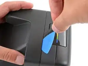 Вставьте плоский край лопатки в зазор между передней и верхней панелями, прямо над разъёмом USB-C на правом краю.