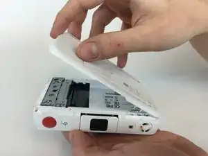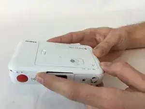 Толкните заднюю панель с короткой стороны, ближайшей к только что снятым винтам, в сторону другой короткой стороны камеры. Она должна сдвинуться вперёд и разблокировать защёлки, удерживающие её на месте.