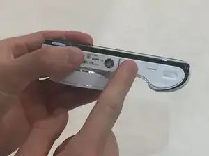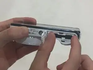 Используя пластиковый инструмент для открытия, отодвиньте защёлку аккумулятора назад и дайте аккумулятору выпасть.