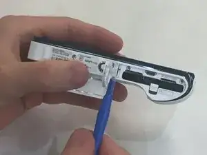 Отодвиньте крышку аккумулятора с помощью пластикового инструмента для открытия. Этот отсек находится в нижней части камеры, а не под объективом.
