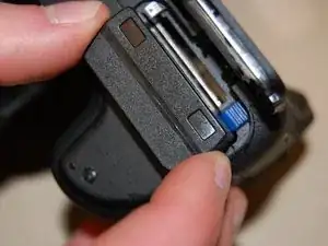 Сдвиньте синий переключатель в сторону камеры в направлении стрелки на переключателе. Когда переключатель будет нажат, аккумулятор выскочит.