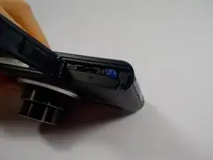 Сдвиньте синюю блокировку аккумулятора в сторону, чтобы освободить аккумулятор.