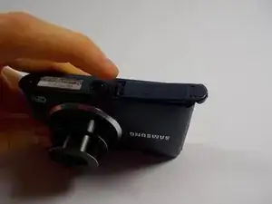 Сдвиньте открыватель аккумулятора в нижней части камеры.