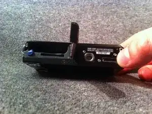 Переверните камеру лицом вниз. Найдите крышку аккумулятора на левом боку дна камеры.