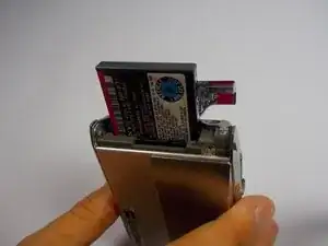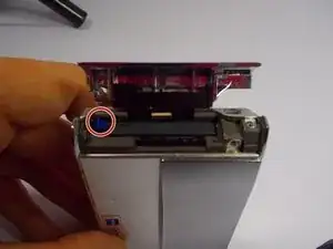 Сдвиньте синюю вкладку к нижней части камеры, чтобы освободить блок аккумулятора.